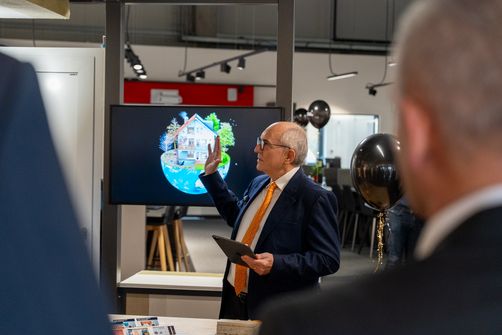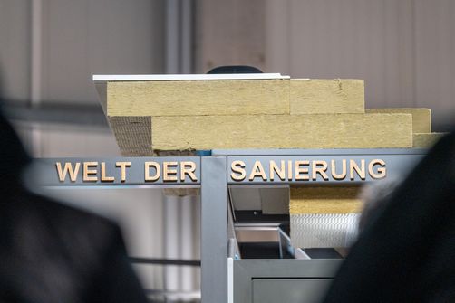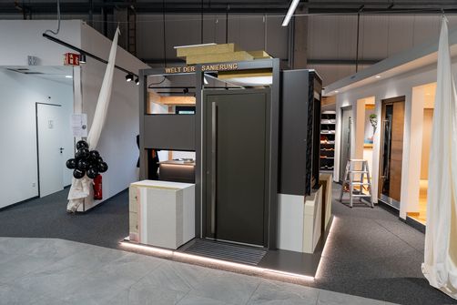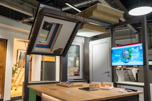 Sanieren ist nicht nur im Arbeitsalltag der Mitarbeitenden stets präsent, sondern auch zentraler Bestandteil der großflächigen Ausstellung. In dieser ist ein interaktives Modul entstanden, das anschaulich zeigt: Raab Karcher in Bingen begleitet die Kunden bei einem Sanierungsprojekt vom Boden und dem Innen- und Außenbereich bis hin zu Fenster, Türen, Decken und Dächern. Von der Dämmung der Dachschräge über den Austausch alter Fenster und Außentüren bis zur Dämmung der Kellerdecke– am Modul wird jedes Element greifbar.